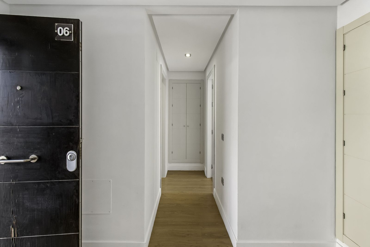 We go back inside, to the hall that has built-in wardrobes, which connects us with the spacious bathroom with a double sink and a large window, and with the bedroom that has two exits to the terrace.