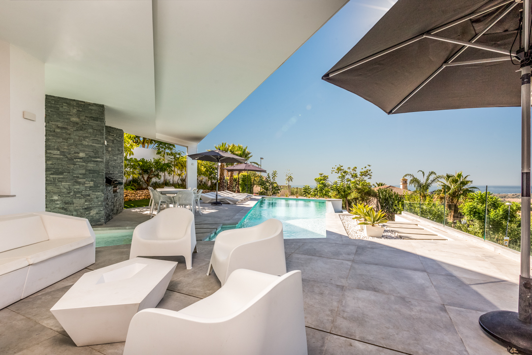 Floor-to-ceiling windows open the home to the vast expanse of the Mediterranean, with views of Gibraltar and the African coast. Soak in your own private infinity pool or lounge in the lavish, cool interior. Private, gorgeous baths in every room.