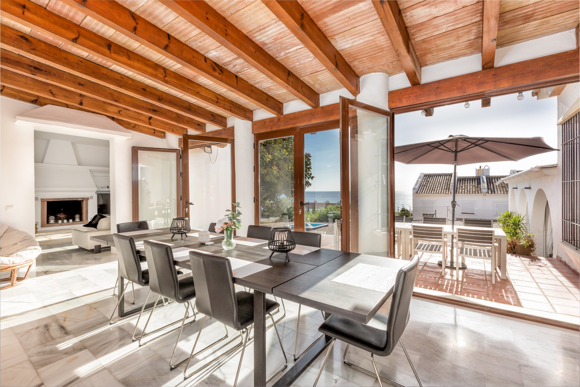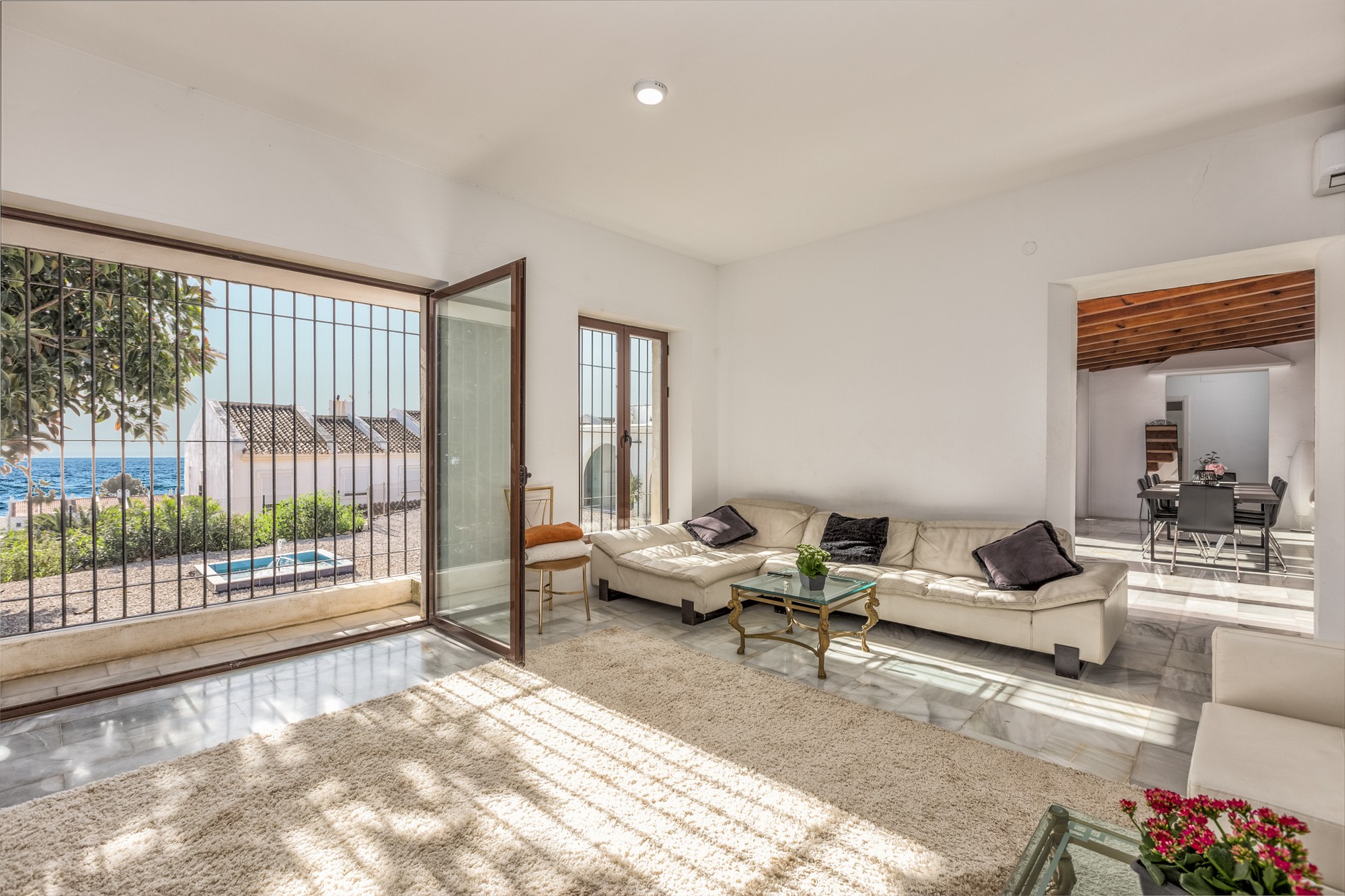 Holiday home in Manilva, 100 meters from the beach – Playa de La Duquesa, with panoramic sea views. (Important to note the pool is communal for the moment). You have five large bedrooms (including a master suite with dressing room private terrace/sun deck and panoramic sea views) The beach is 100 meters away, restaurants and shops all within short walking distance, and you have private parking.